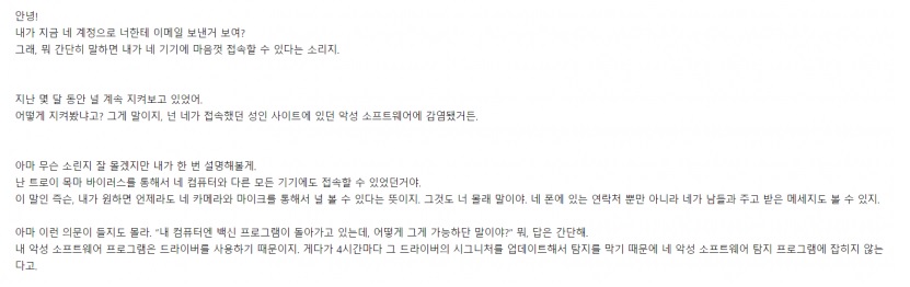 채팅도 다 보았고 전화 도청도 하였고 감시를 합니다. 마찬가지로, 만약 당신이 이 편지에 대해 다른 사람에게 말한 것을 알게 된다면, 비디오는 즉시 웹에 공유될 것입니다!