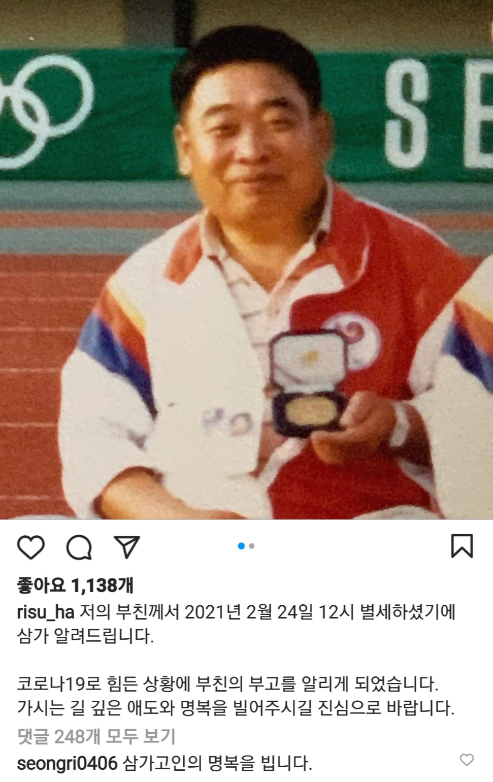"저희 부친께서 2021년 2월24일 12시 별세하셨기에 삼가 알려드립니다"라고 전했다.