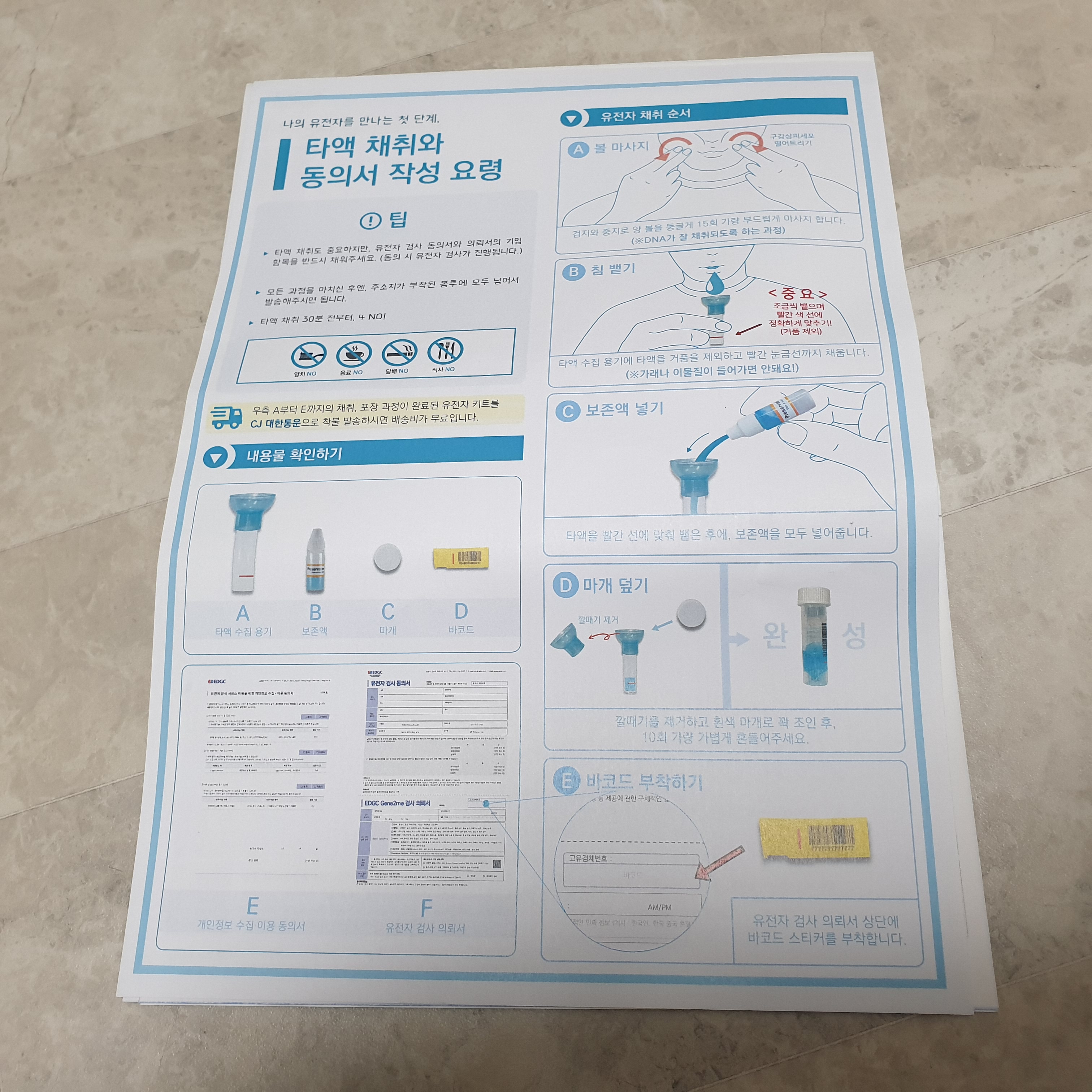 꼭체크해야하는 부분과 제공된 바코드까지 키트 박스에 넣어서 착불로 보내면