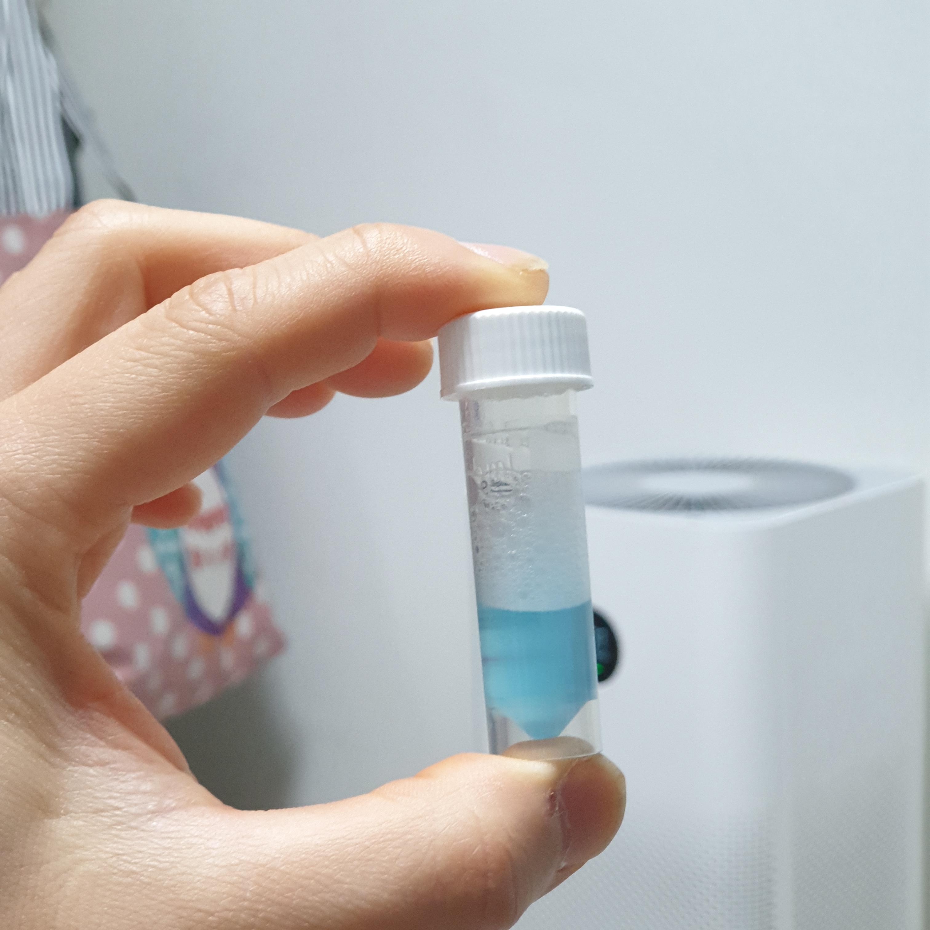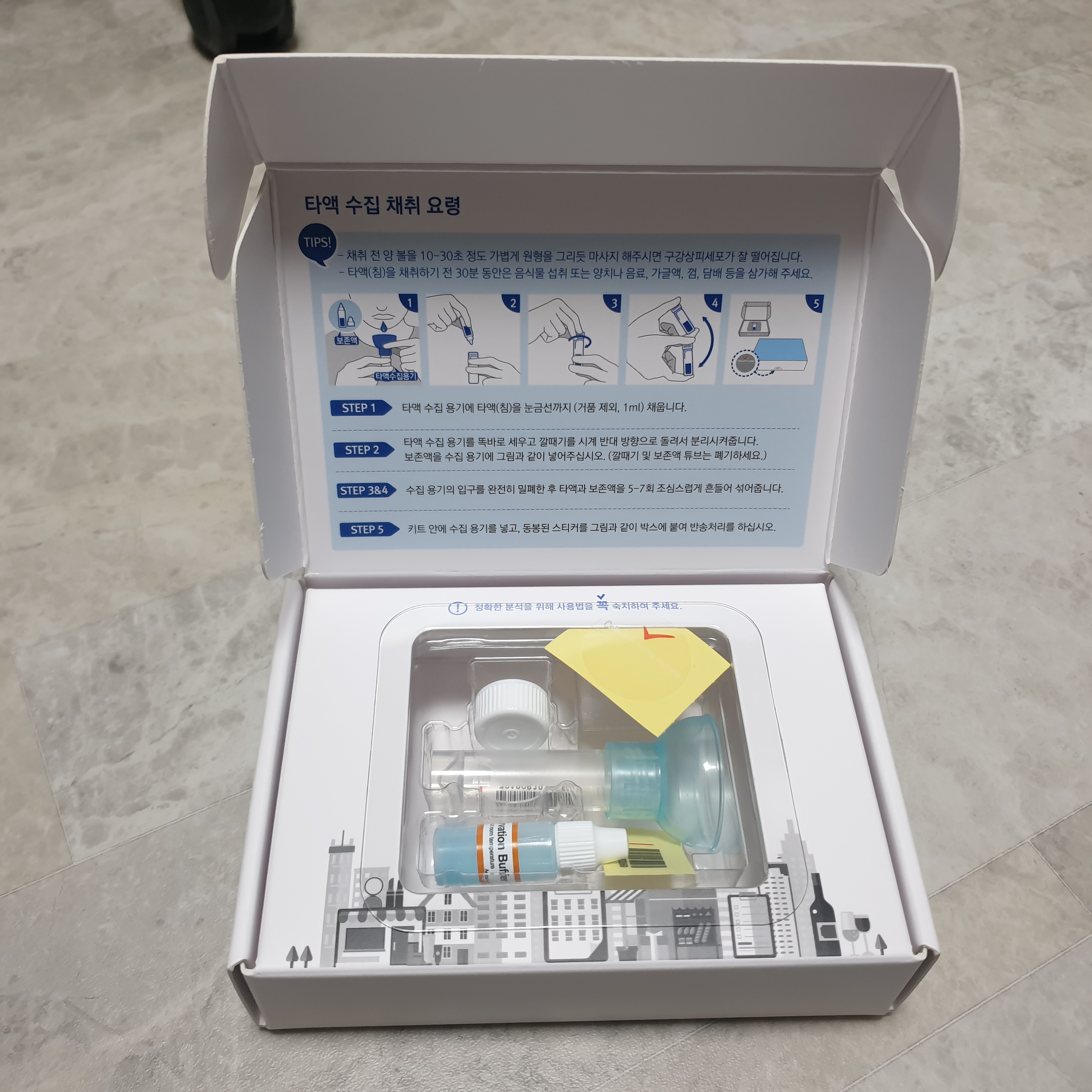 제일 커보이는 통에 침을 빨간색까지 넣고 (거품제외) 오른쪽위에 보존액을 넣고 뚜껑닫는다.