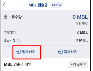업비트 앱에 들어가서 입출금을 눌러 MBL을 검색하면 무비블록이 나오는걸 확인할수 있고여기서 입금하기를 누른다.