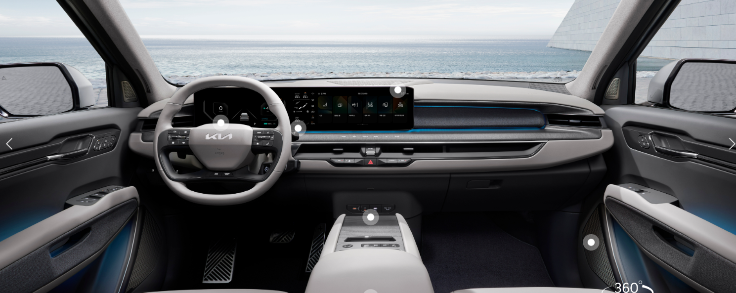실내 디자인 같은 경우 가장 눈에 띄는건 넓은 공간감을 보여주는것이 가장 큰 특징중 하나라고 할수 있습니다. 전반적으로 깔끔한 느낌으로 다가오면서 물리버튼들이 배열되어 있습니다. 운전석 앞으로 12.3인치 디지털 클러스터와 인포테이먼트 기능, 가운데는 5인치의 공조 스크린이 있어 일체형으로 구현된 디스플레이가 있습니다.